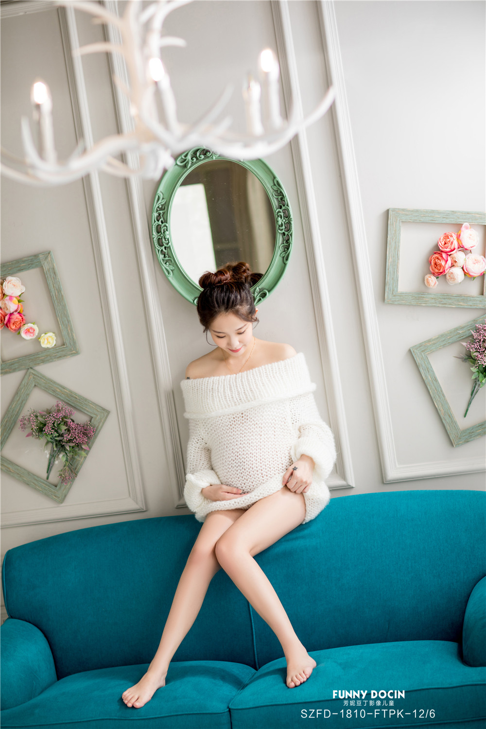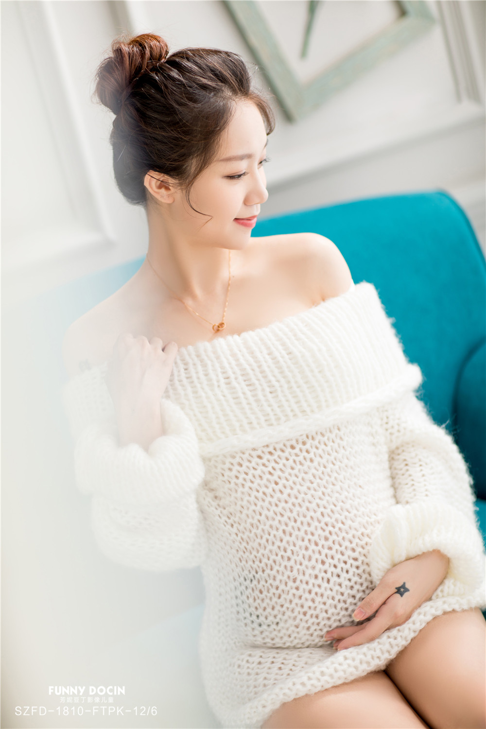 白色露肩毛衣裙,蓝色沙发