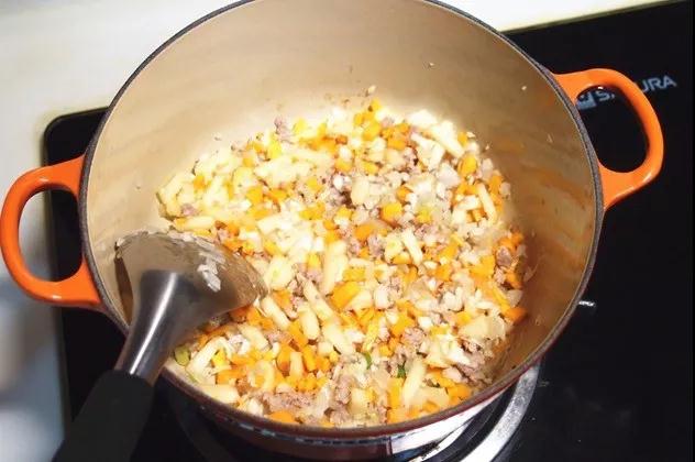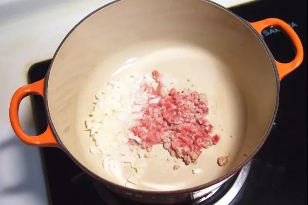 3. 猪肉本身的油脂已经非常足够,所以无需再另外加油,直接将肉末下锅煸香逼油,再加入洋葱煸香。