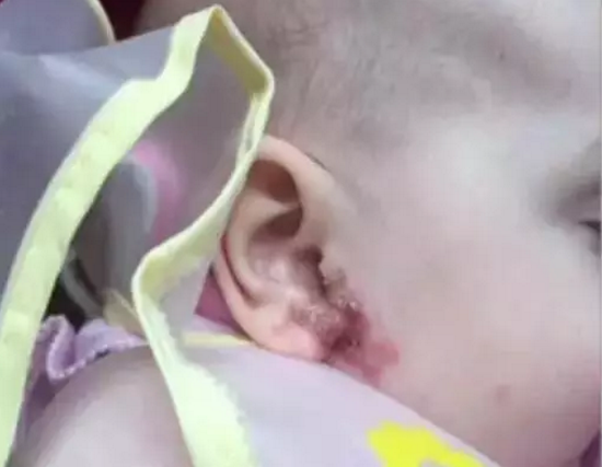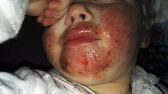 可在生日后不久,小女孩的嘴里开始长溃疡,然后从下巴蔓延到整个脸颊,几乎整张脸都长出了带状疱疹,就像是被硫酸泼过一样。